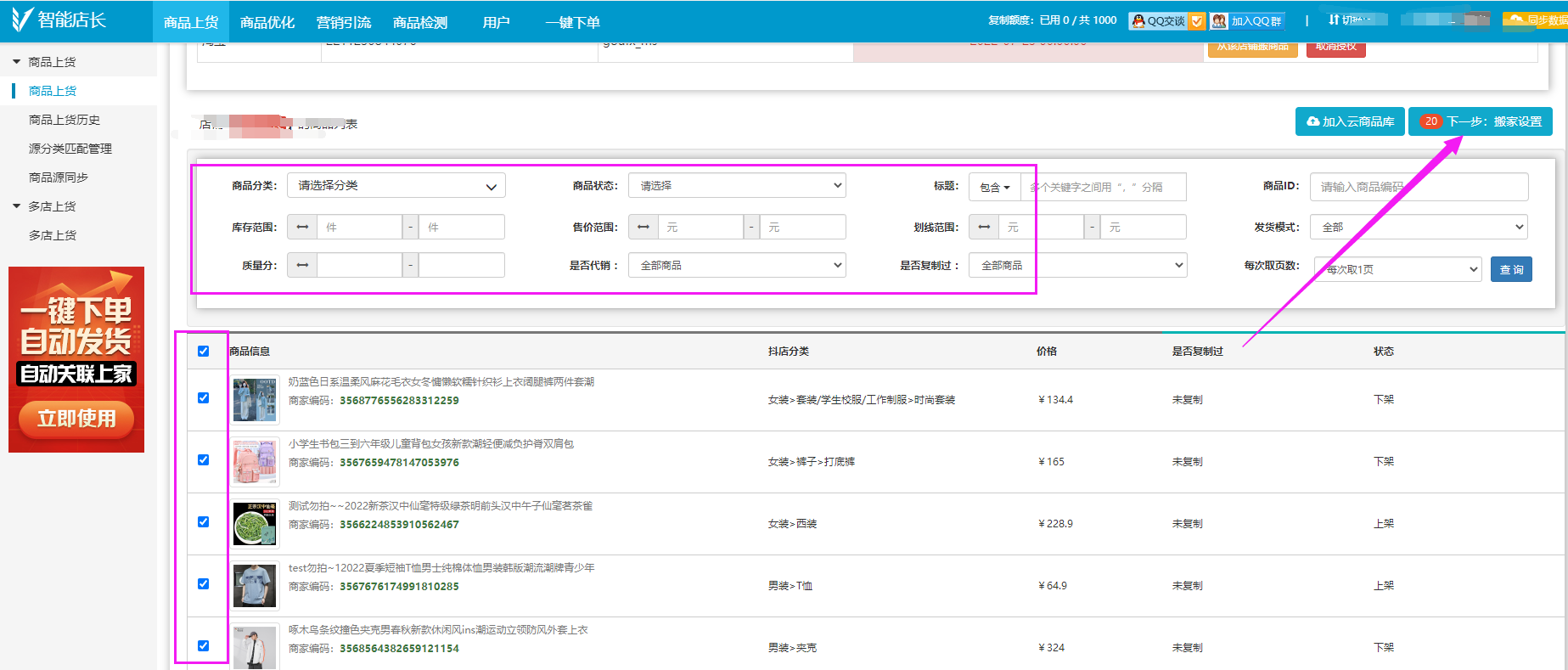 4、下方会出现这个店铺的所有商品,我们选择需要复制的商品将它们勾选起来(可以通过条件筛选,来快速查找商品)之后再点击下一步-搬家配置即可