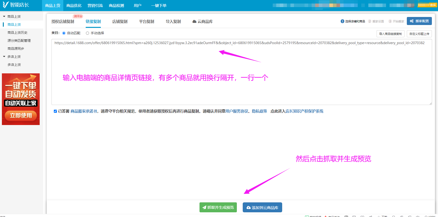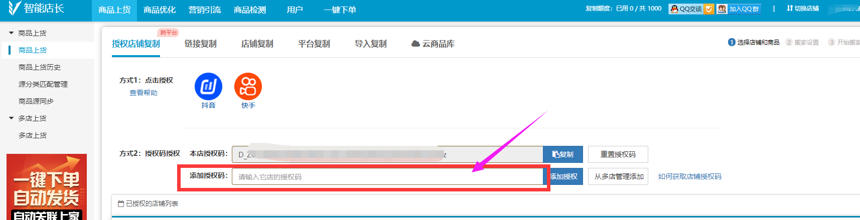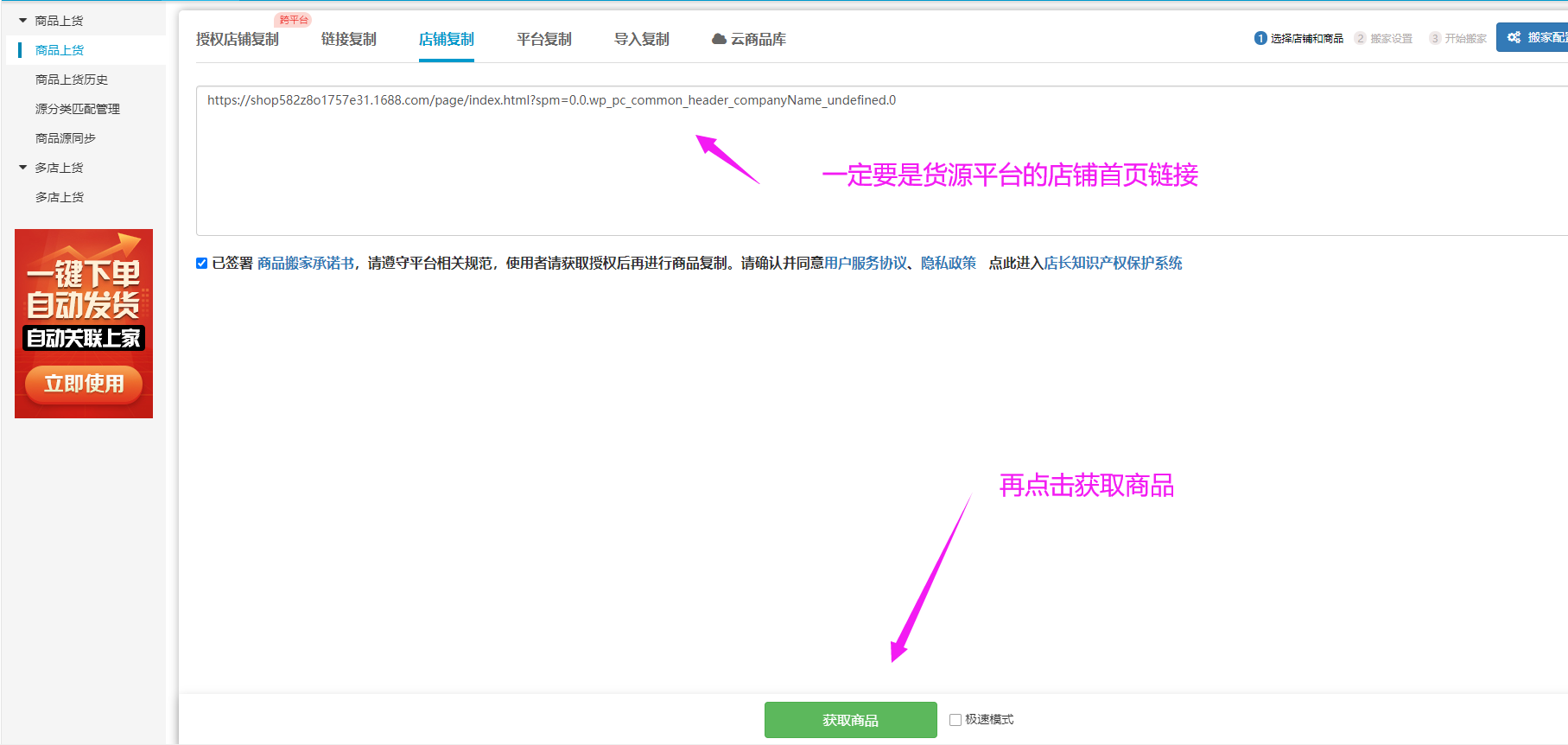 1、点击商品上货-授权店铺复制,根据如下链接提示获取需要复制的平台店铺