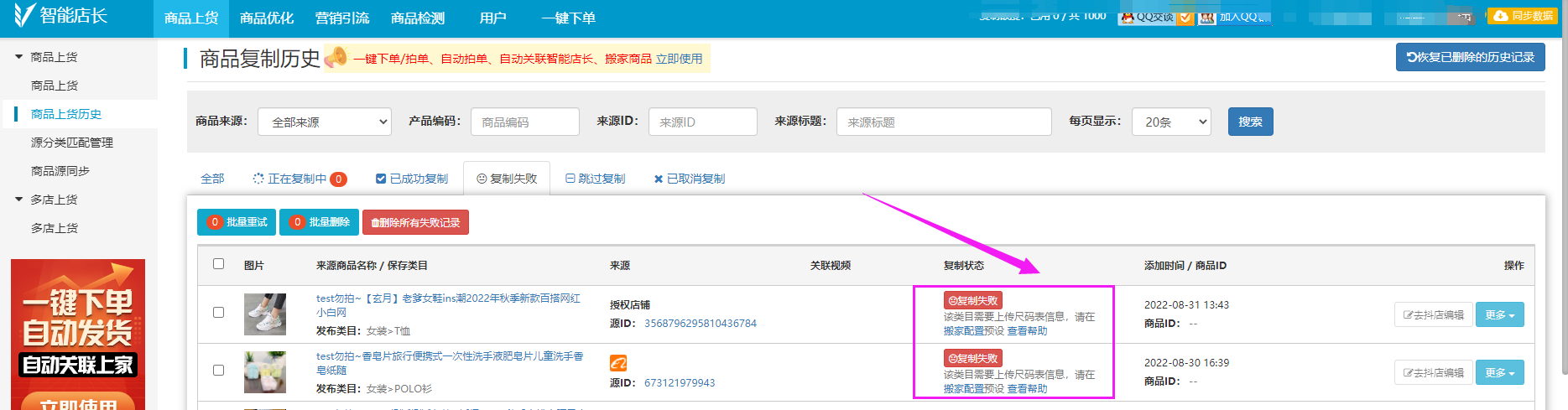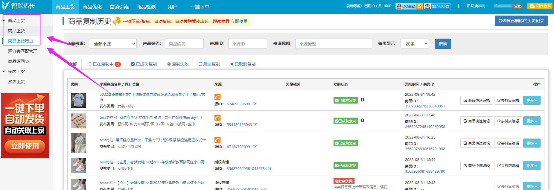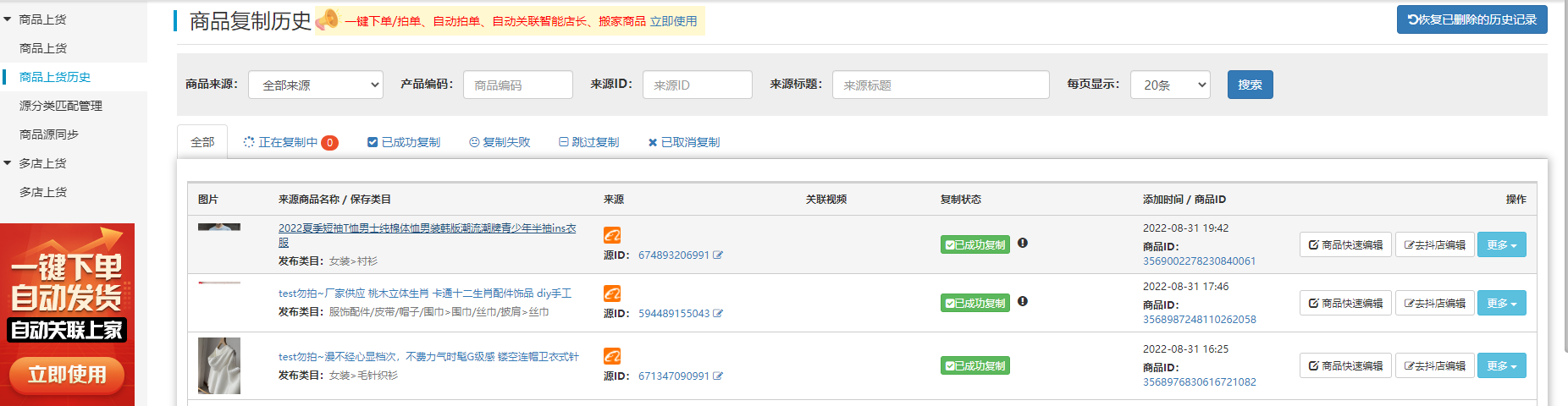 商品上货历史这边可以看到刚才复制的商品情况