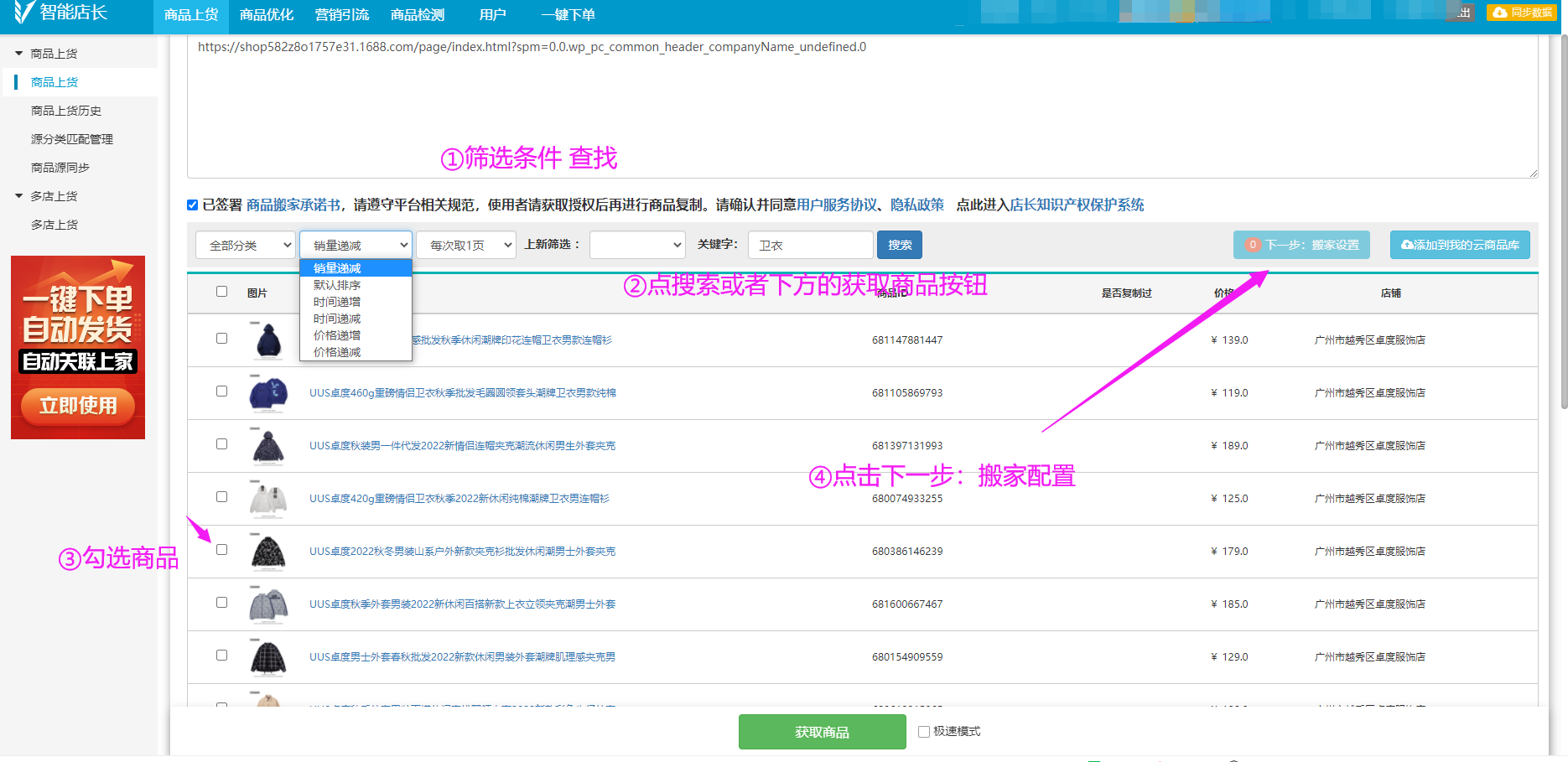 第二步:将店铺首页黏贴完成后,单击获取商品,将会获取黏贴来的店铺全部商品,获取完成后可以自行勾选我们需要的商品,也可以根据商品列表上方的下拉选项和关键词进行定位选择。