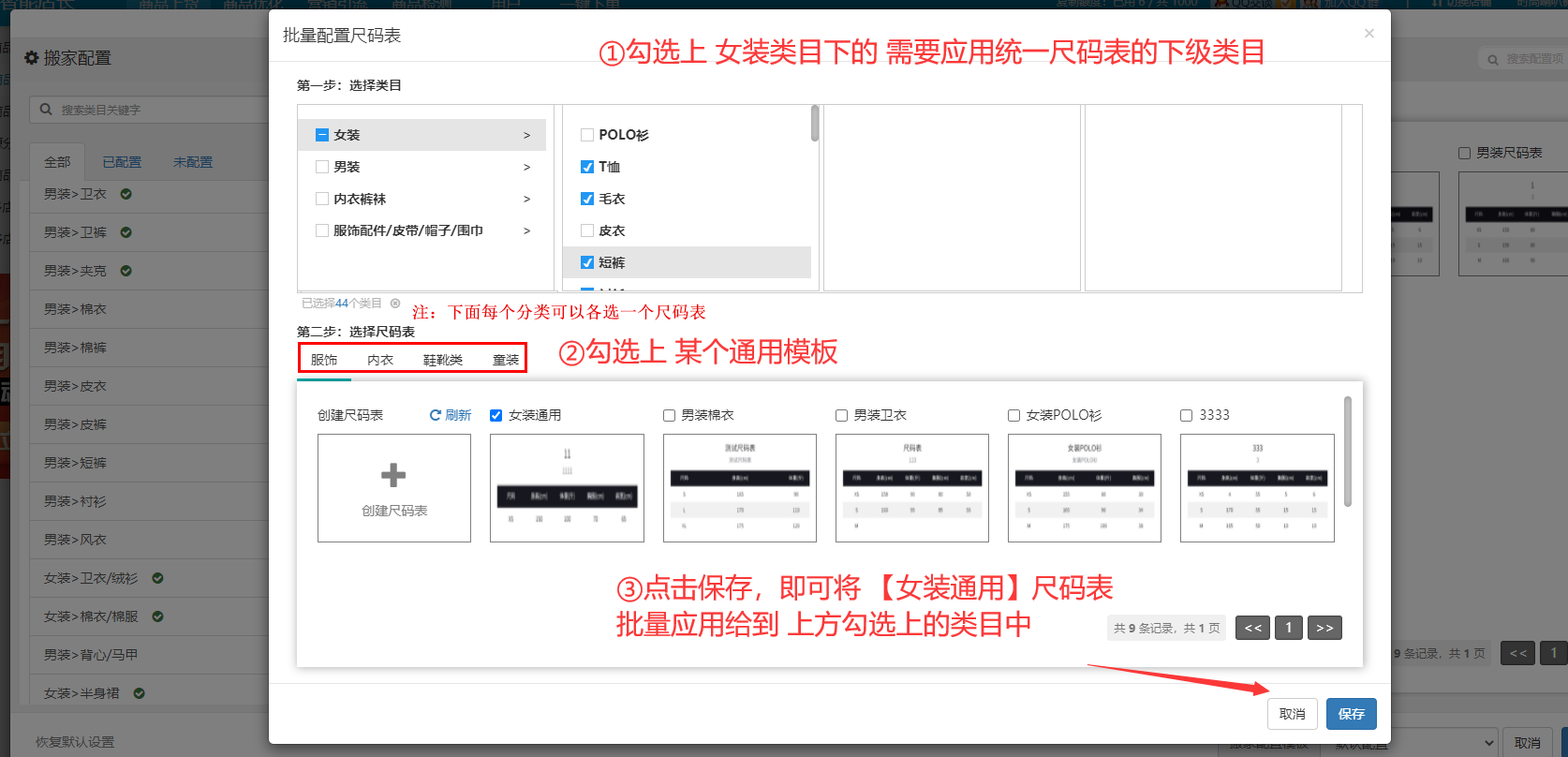 步骤4.2:根据下方图中的①②③步骤,我们可以将某个通用的尺码表,批量应用给到某个类目的下级类