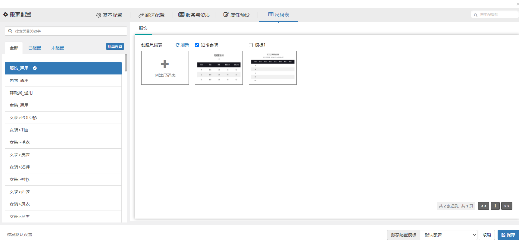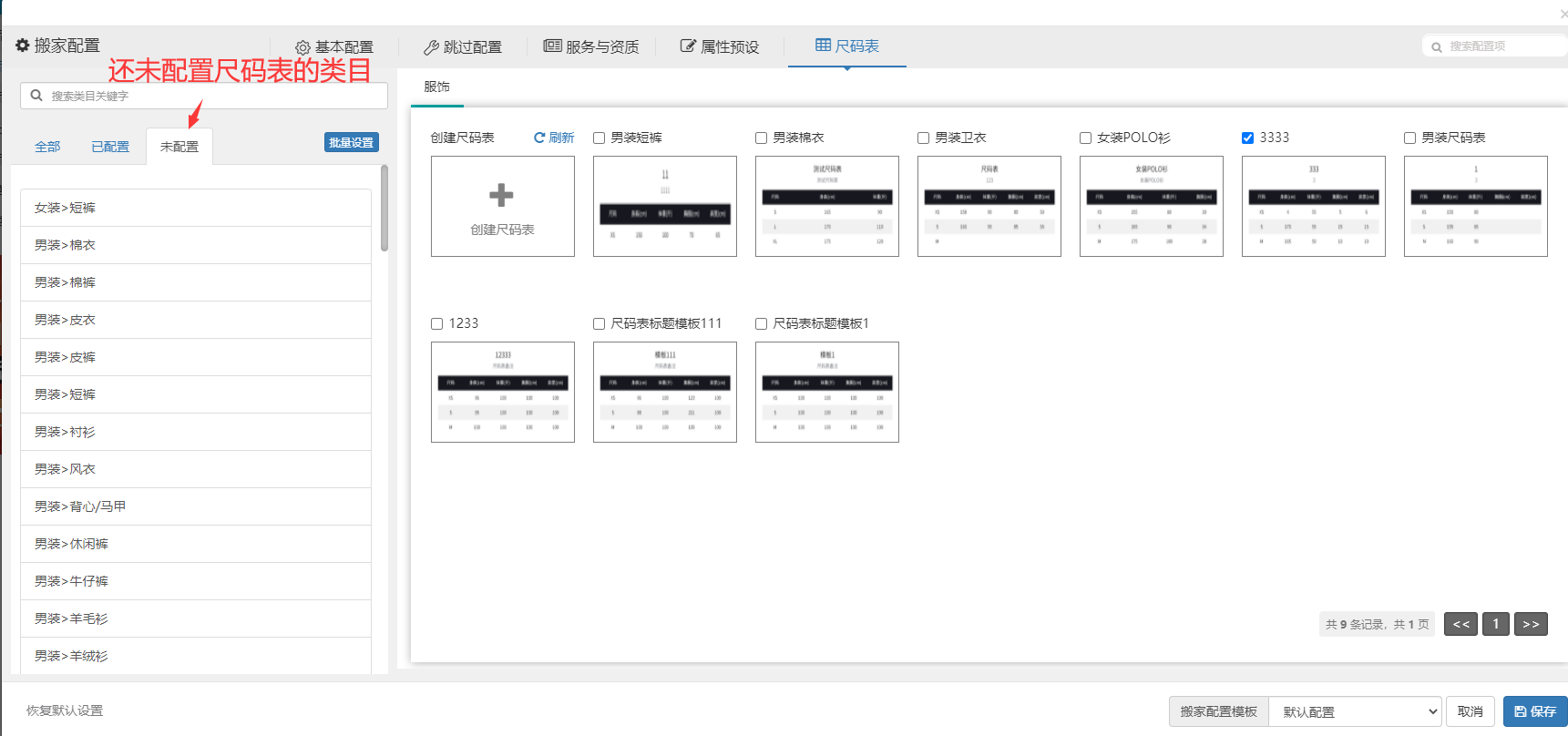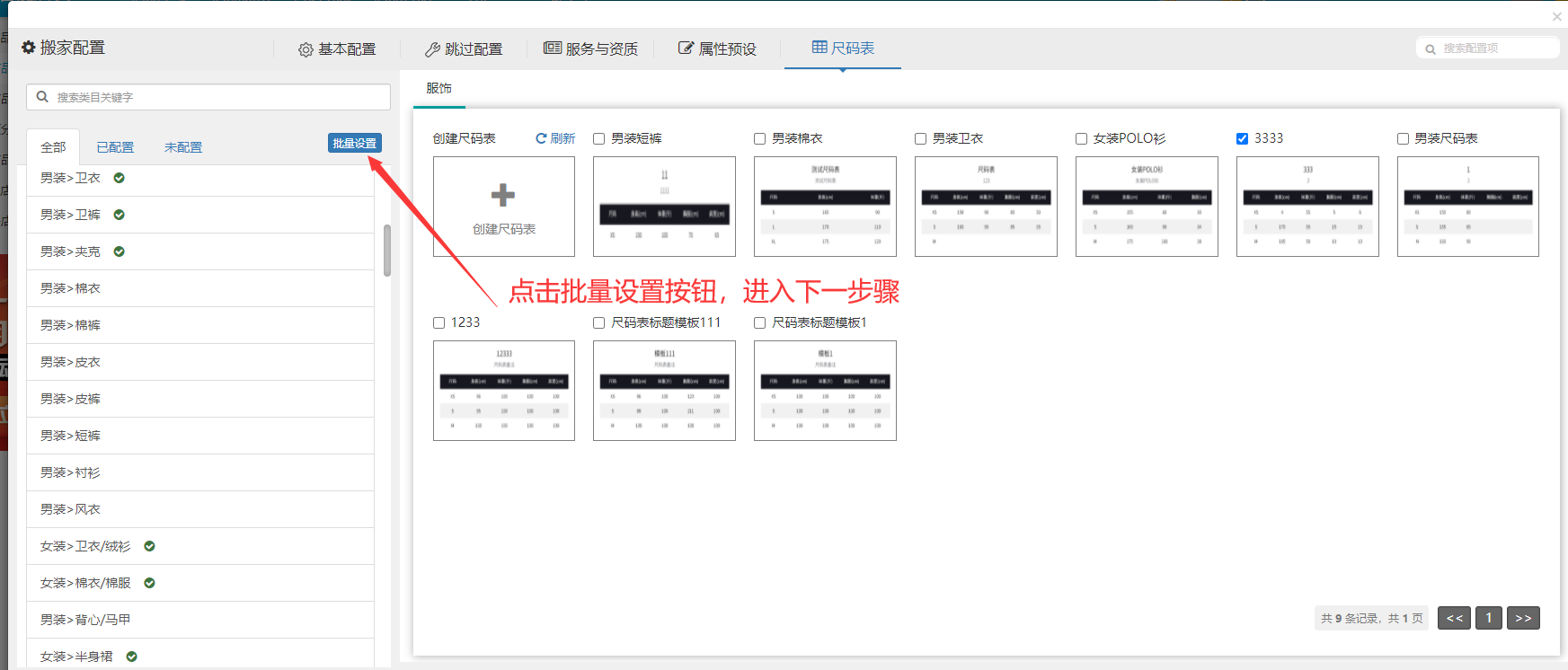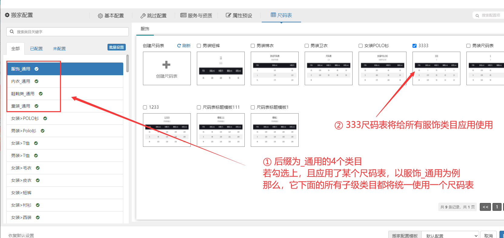 步骤4.3:同4.2的批量设置相类似(以勾选服饰_通用为例)那么,图中的333尺码表将应用给所有服饰类目使用