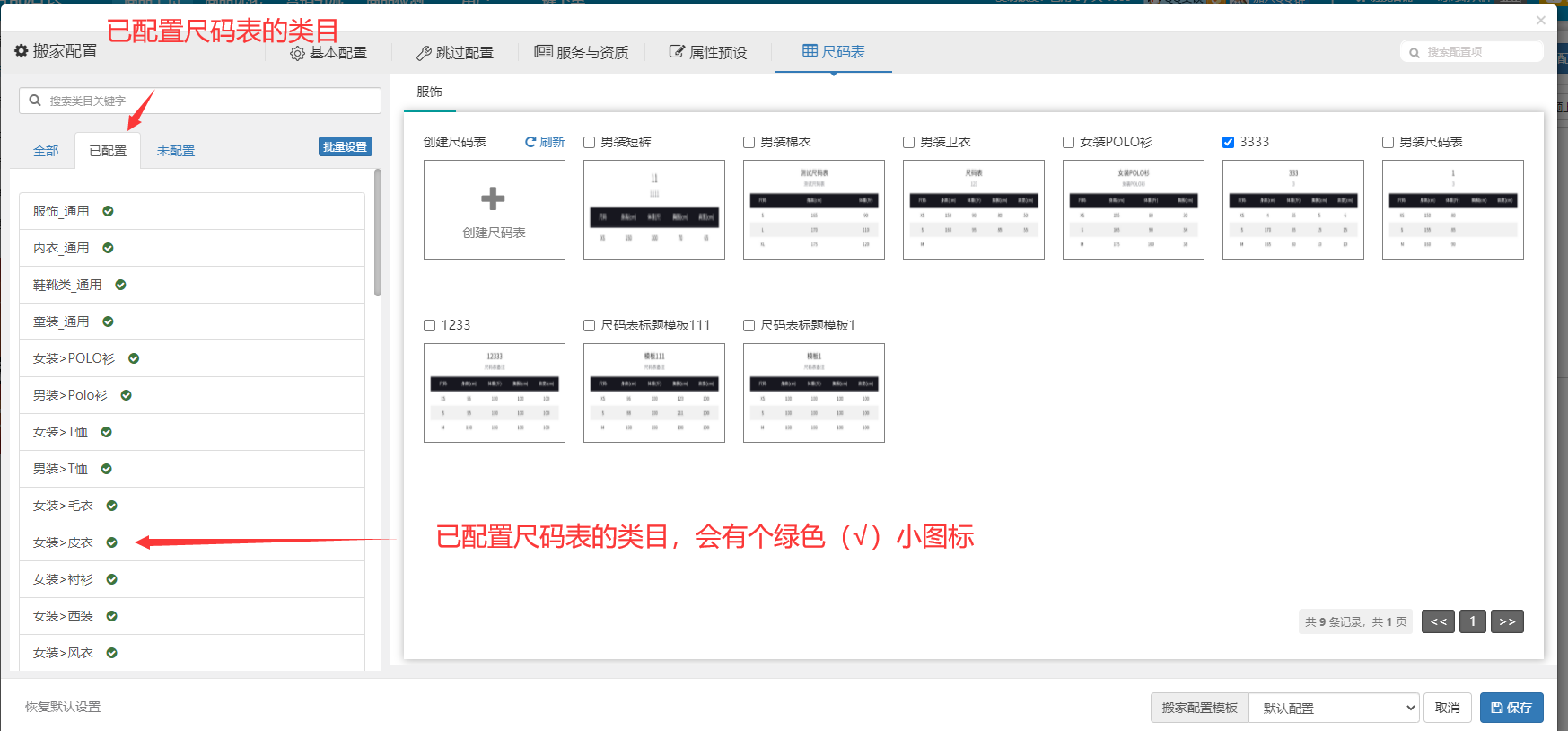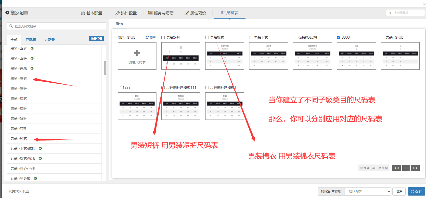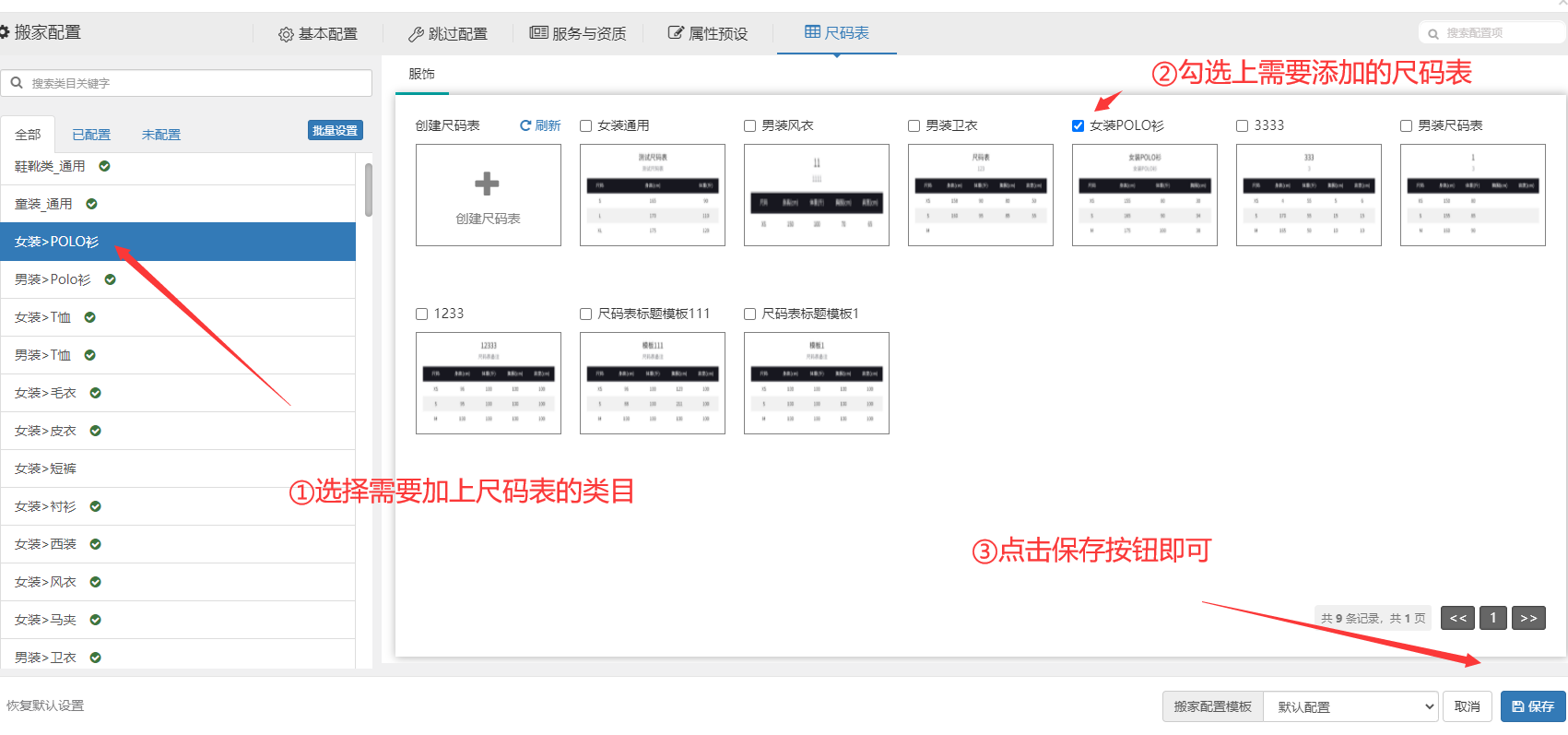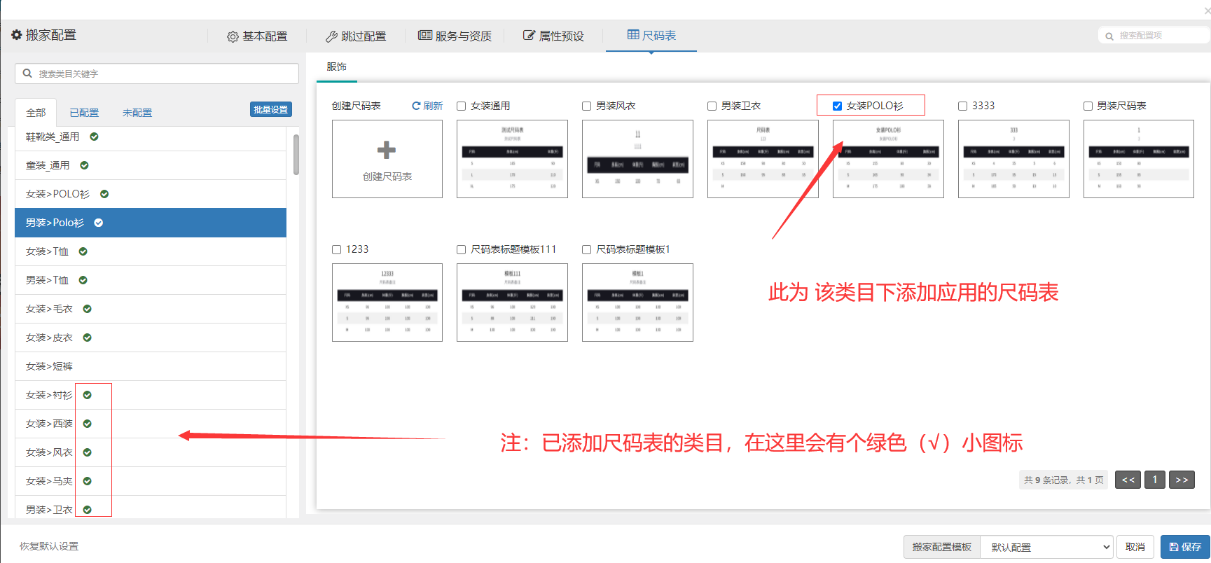 步骤2.4:尺码表确认无误后,我们可以选择某个需要加上尺码表的类目,并勾选上需要添加的尺码表,然后点击保存即可