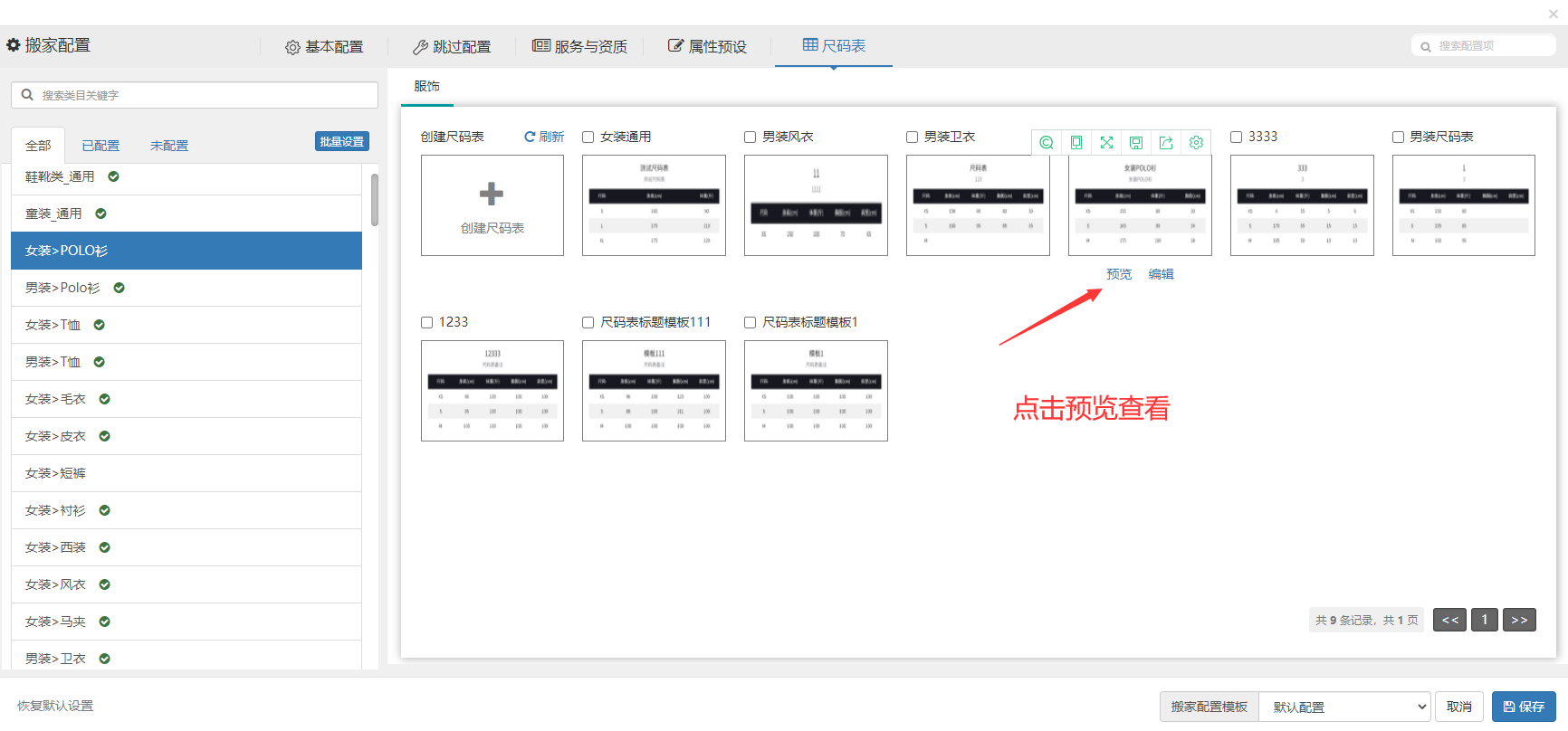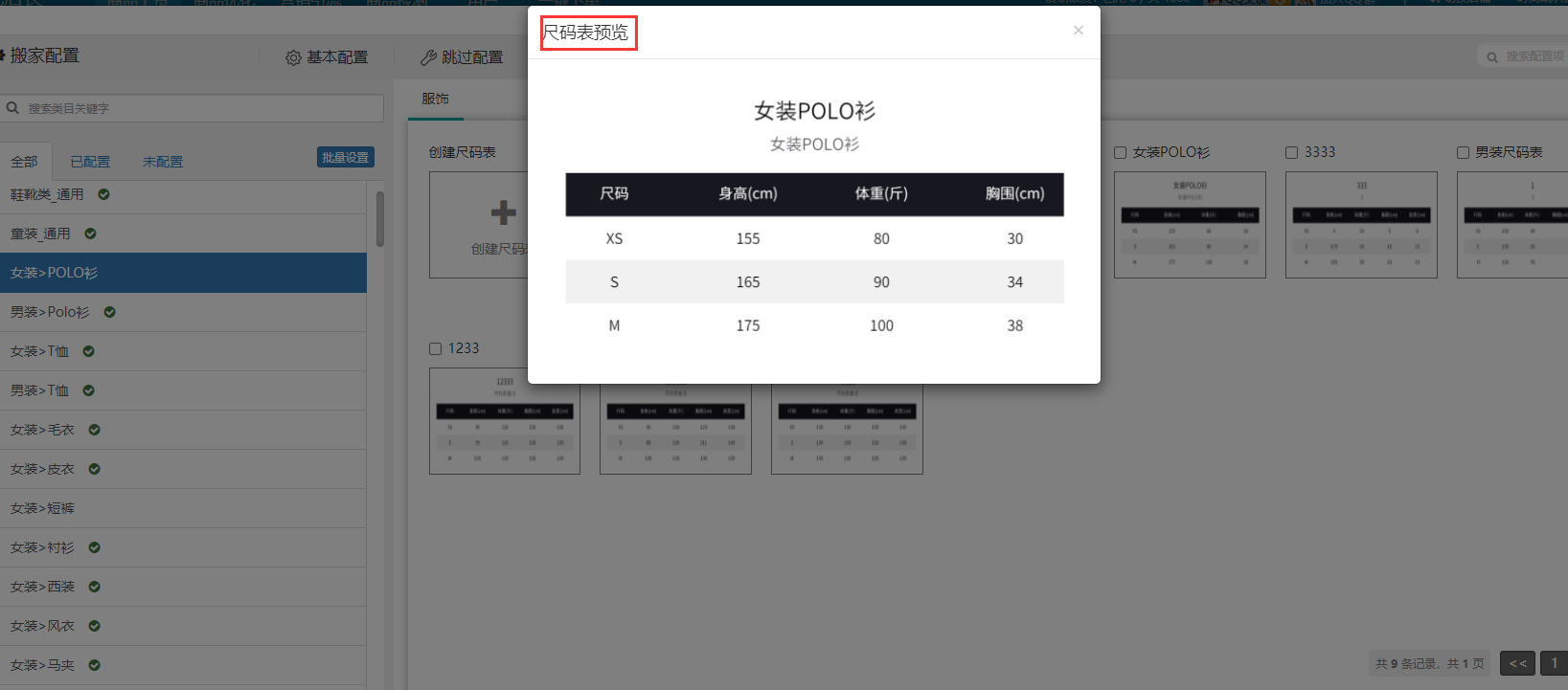 我们也可以点击预览,查看新建或编辑的尺码表