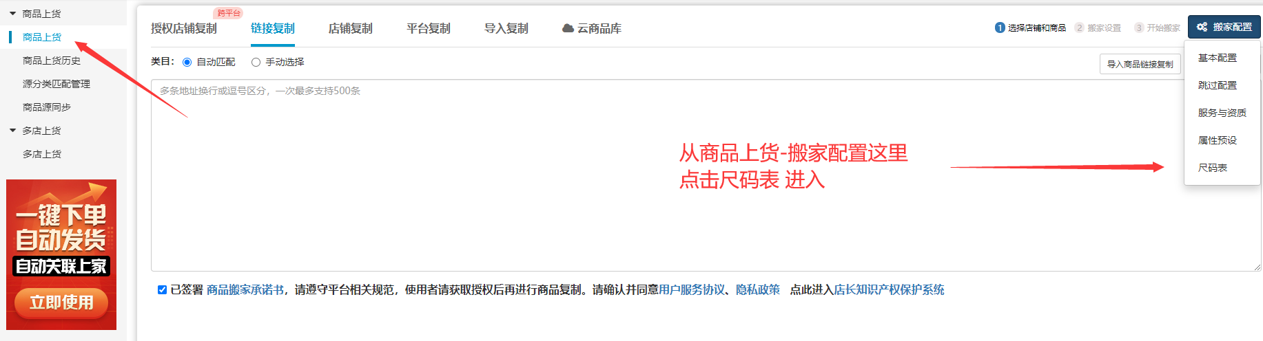 步骤1.2:我们也可以从商品上货功能入口,点击右侧蓝色(搬家配置)按钮,点击下方的尺码表