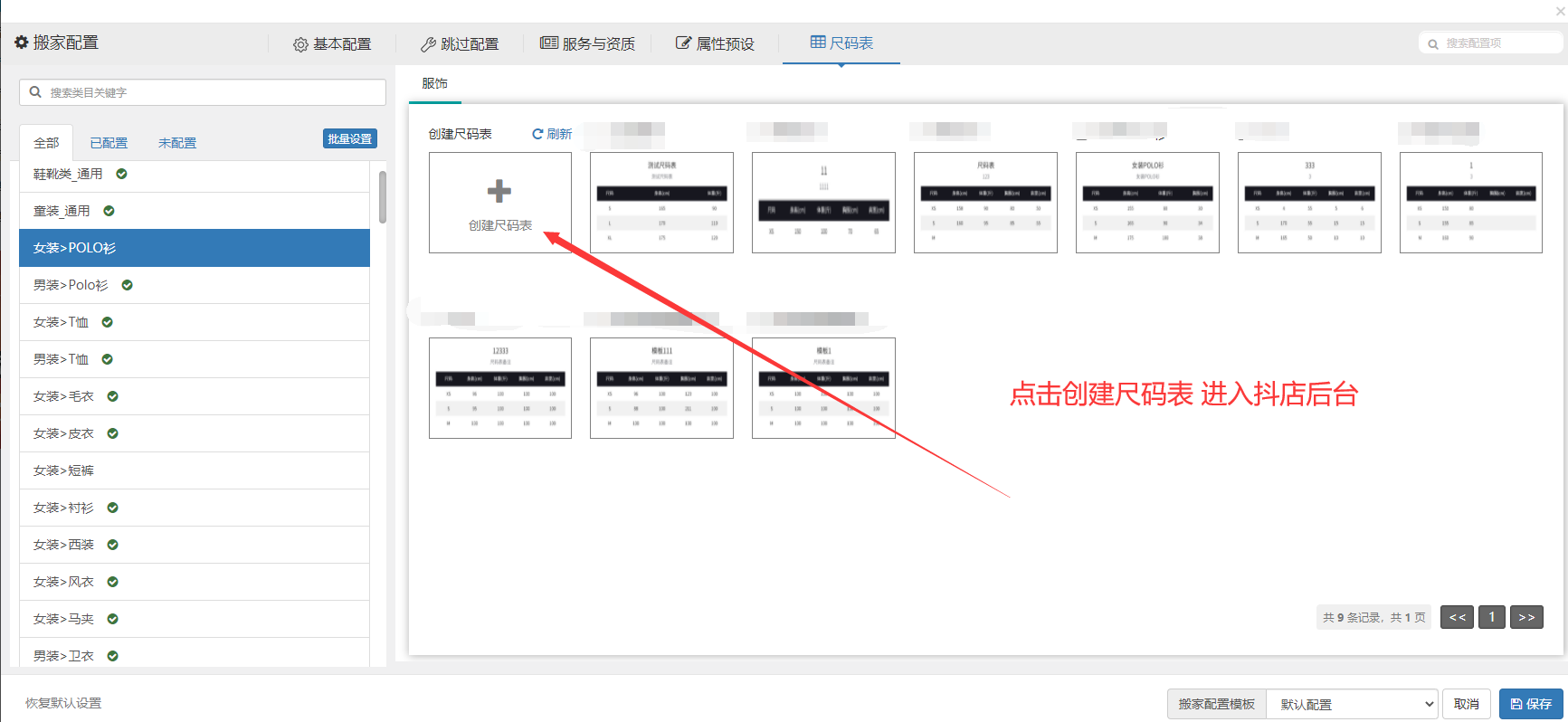 步骤3.1:尺码表配置处,可以看到所有在抖店后台建立的尺码表,我们可以根据细分的尺码表来逐一对二级类目进行应用使用