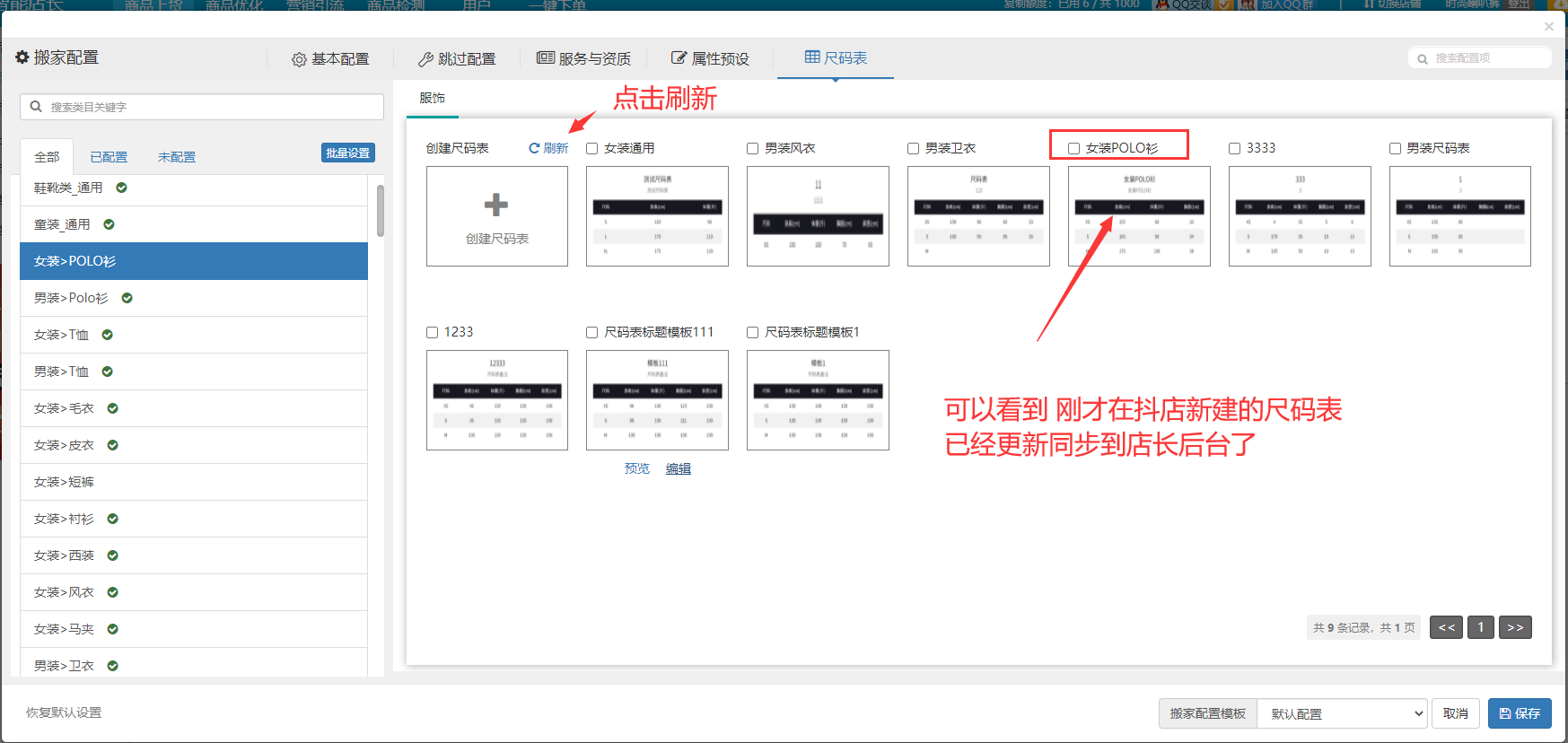 步骤2.3:保存完毕后,我们可以回到店长后台,点击刷新,即可看到刚才新建的尺码表,已经同步过来了