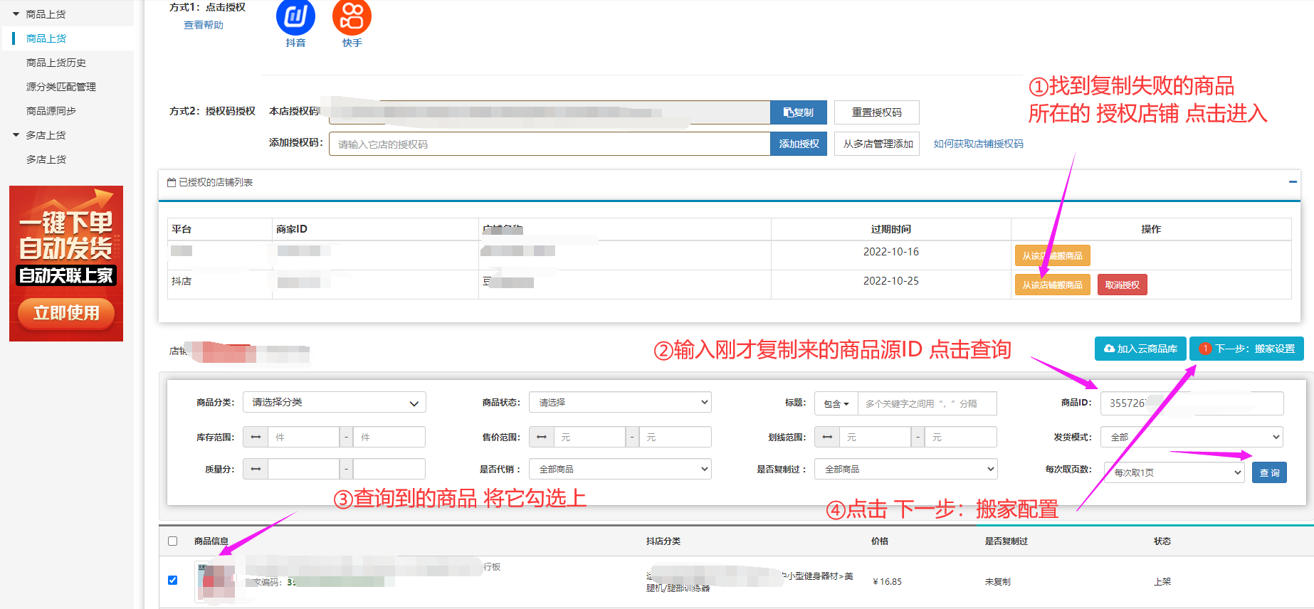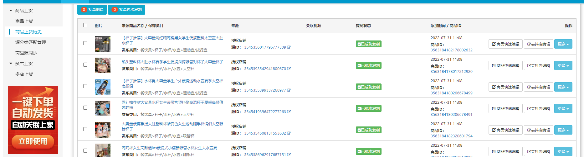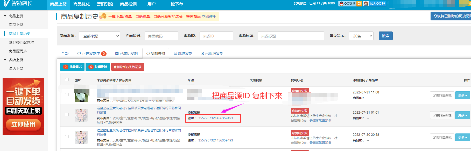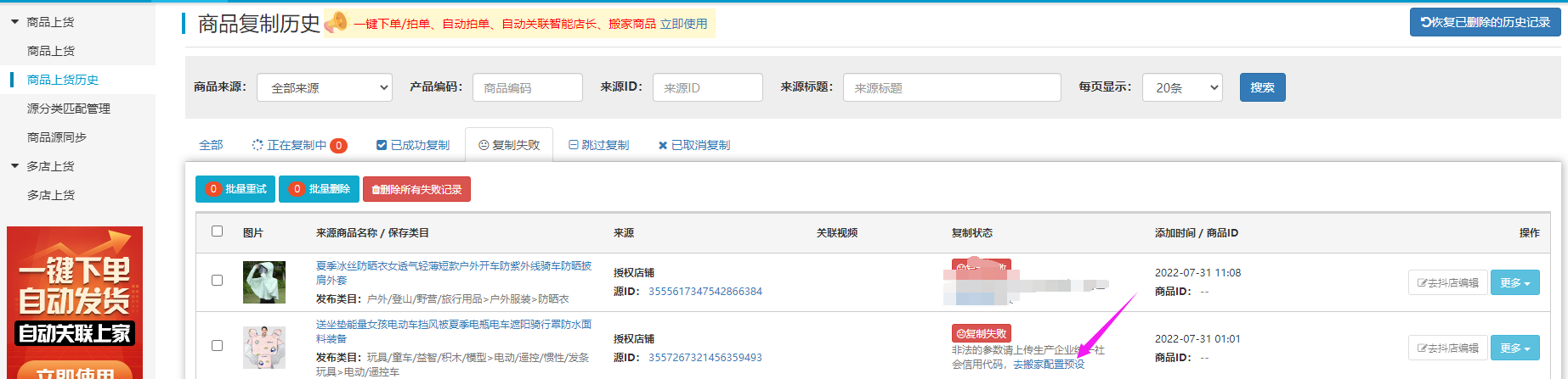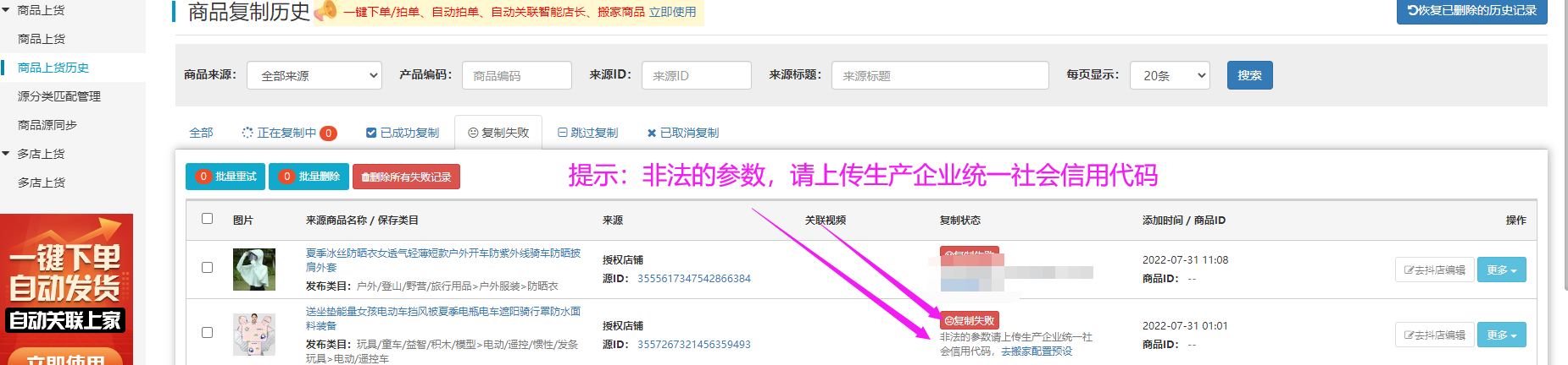 步骤2.2:【非货源平台商品】如:抖店授权店铺的商品,可以在上货历史处,将复制失败的商品ID先复制下来