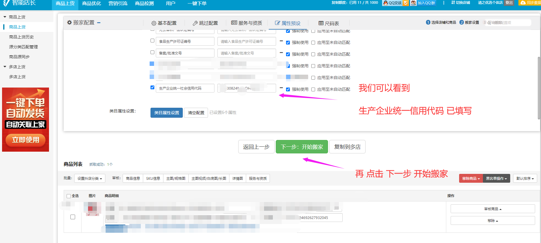步骤2.4:重新搬家后,稍等片刻,就可以看到原先提示‘’非法的参数请上传生产企业统一社会信用代码”复制失败的商品,已成功复制