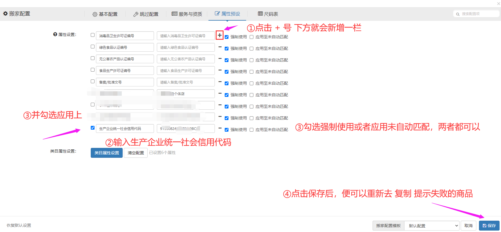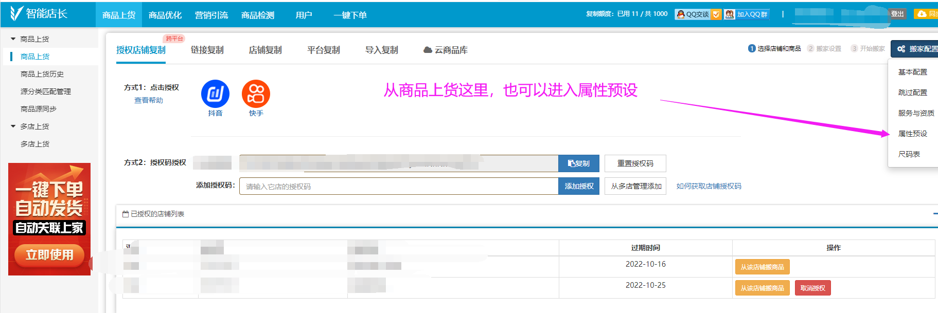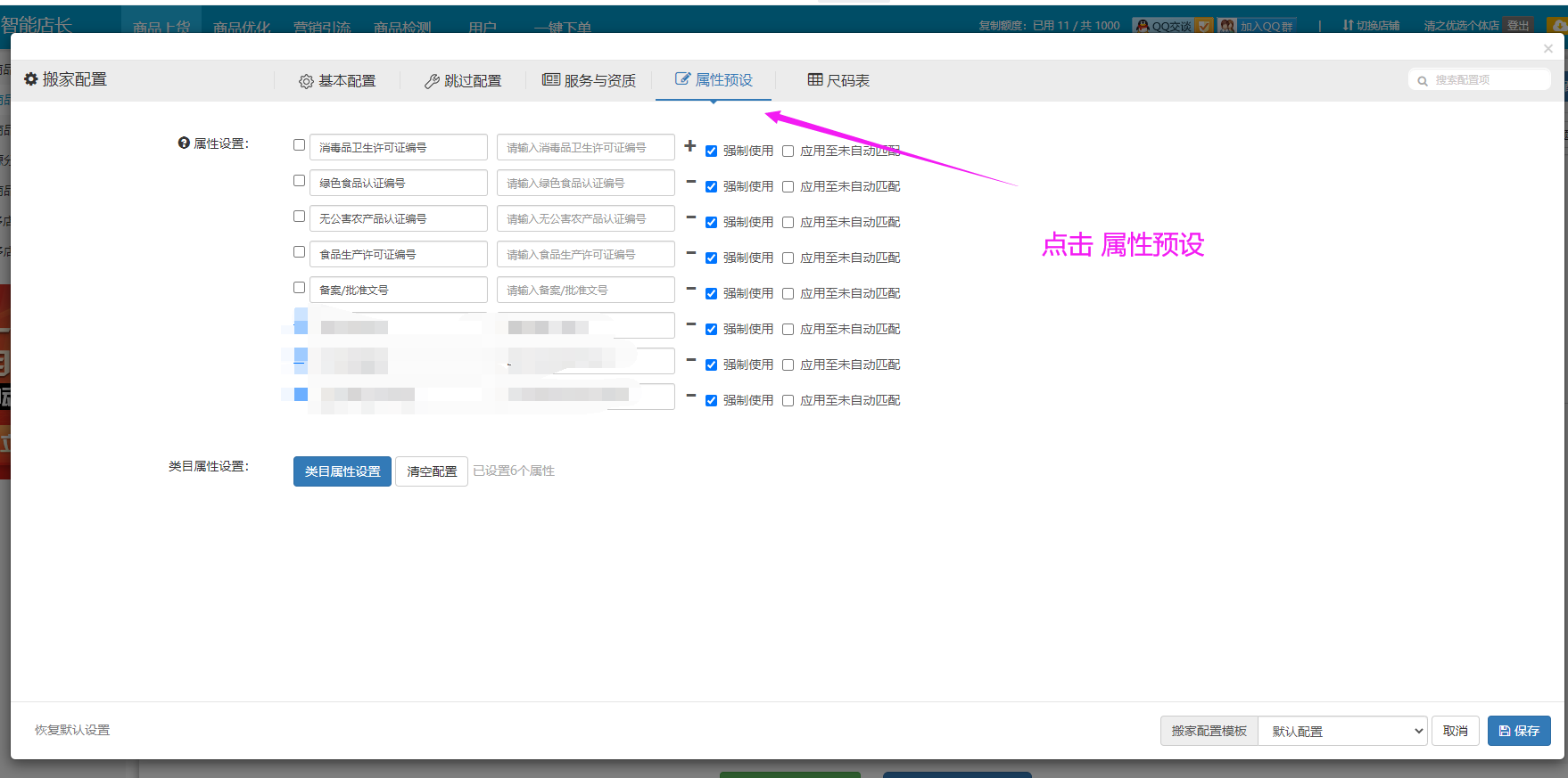 步骤1.2.1:我们还可以从上货功能入口处,点击搬家配置按钮,进入属性预设配置
